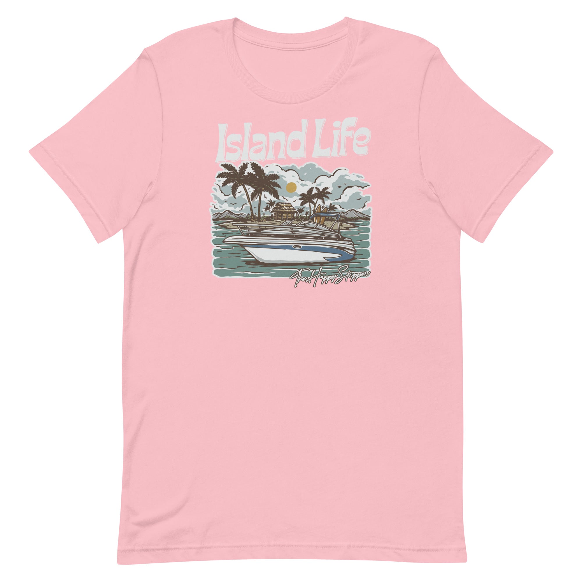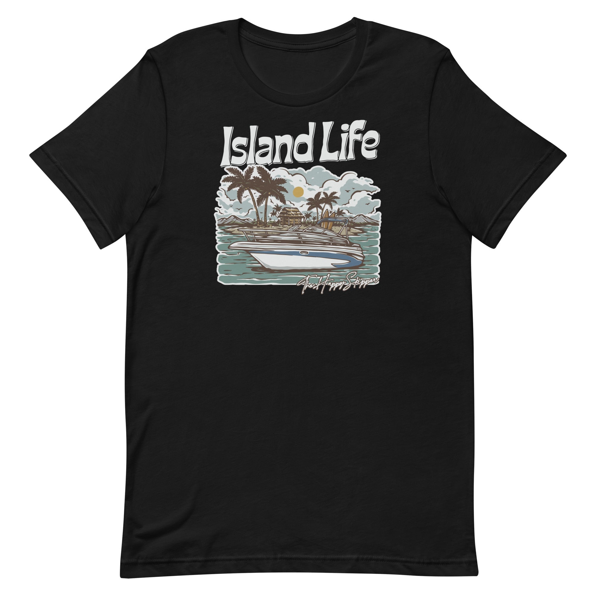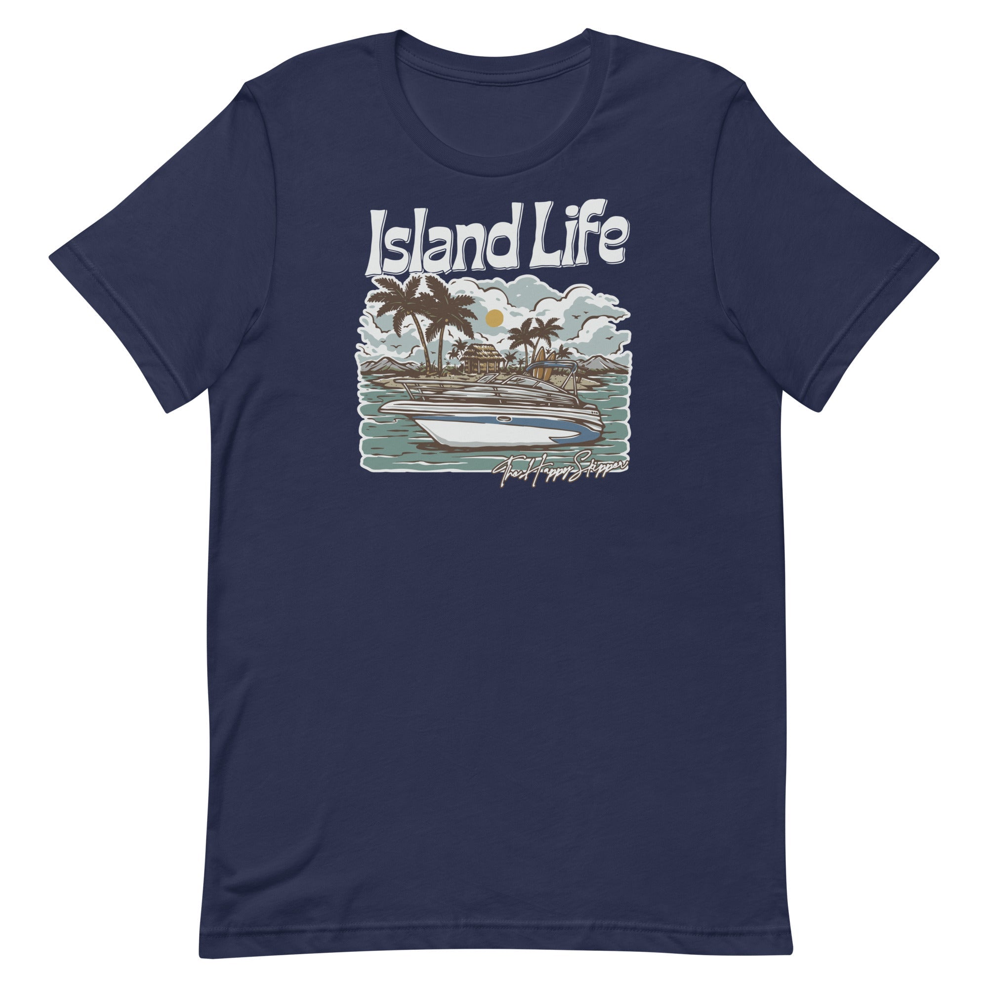 Welcome to the laid-back atmosphere of island living with The Happy Skipper Island Life T-Shirt. Designed with a captivating boat lovers island print on the front, this tee features towering palm trees, a sunset backdrop, crystal blue waves, and a cool motorboat, invoking the allure of beach life wherever you are. Crafted from 100% high-quality combed and ring-spun cotton, , this lightweight, breathable t-shirt blends comfort and durability seamlessly. Available in sizes X Small to 3XL and in summer-inspired colors like Tropical Blue, Sunset Orange, and Palm Green, it boasts a regular fit, a ribbed round neck, short sleeves, and a straight hem. Pair this versatile shirt with your favorite shorts or jeans and spread chill vibes as you go about your day. But be warned - wearing this shirt might lead to spontaneous daydreams of your next tropical getaway. So, why wait? Embrace the islander's life, carry the beach with you, and become a happy skipper today with the Island LIfe T-Shirt!